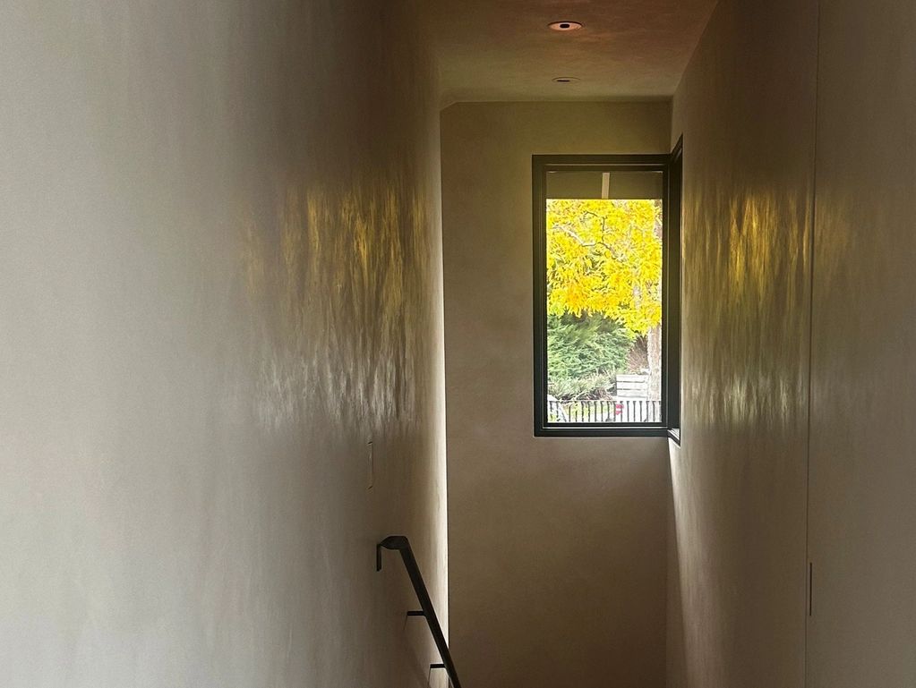 Gypsum plaster can be used to achieve heavily textured and smooth finishes. It dries fairly matte and can be sealed to be shiny. Popular products we use are Portola Paints Roman Clay, and USG Diamond Finish. It is more challenging to control color variation and sheen compared to Venetian plasters. Gypsum plasters are not suitable for wet or high humidity locations.